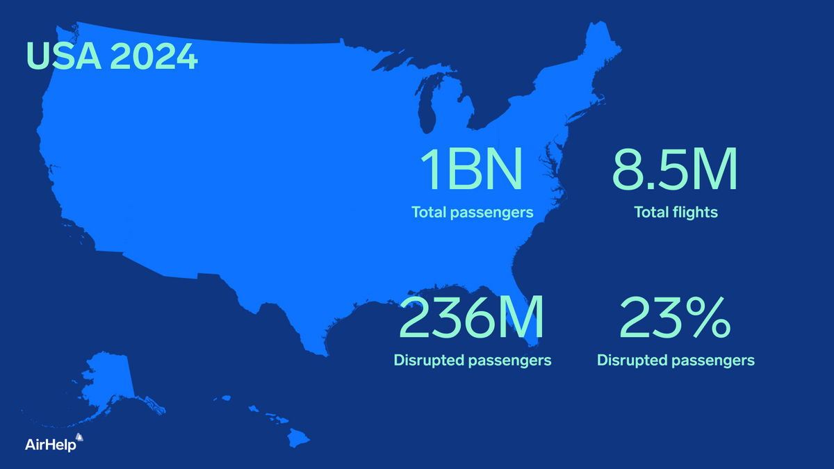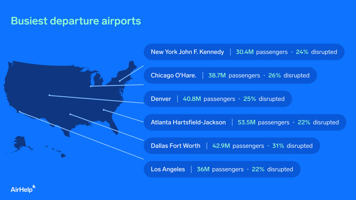 The busiest airport in the US is Atlanta Hartsfield-Jackson — 53.5 million passengers passed through in 2024 alone. Around 22% of them with delay or cancellation en route.