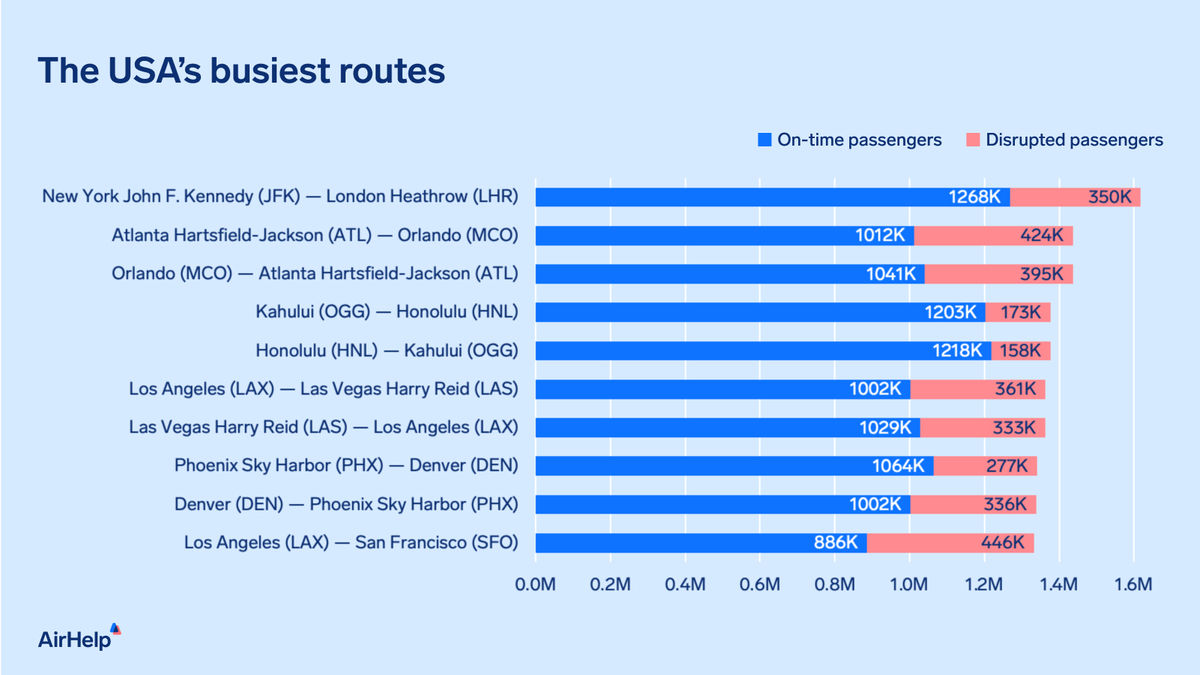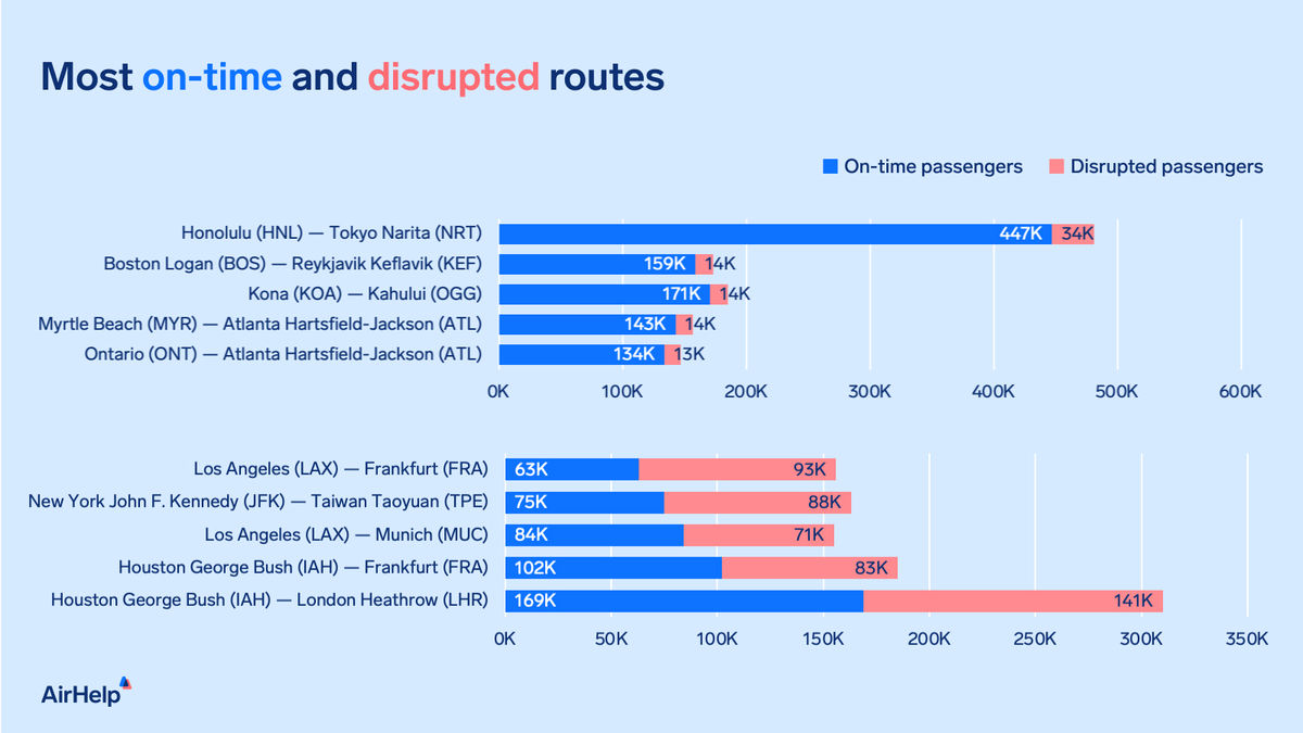 The route to avoid was Los Angeles to Frankfurt Am Main in Germany. This was an incredibly disrupted route, with 60%, or over 90,000 passengers, finding their flight delayed or canceled.