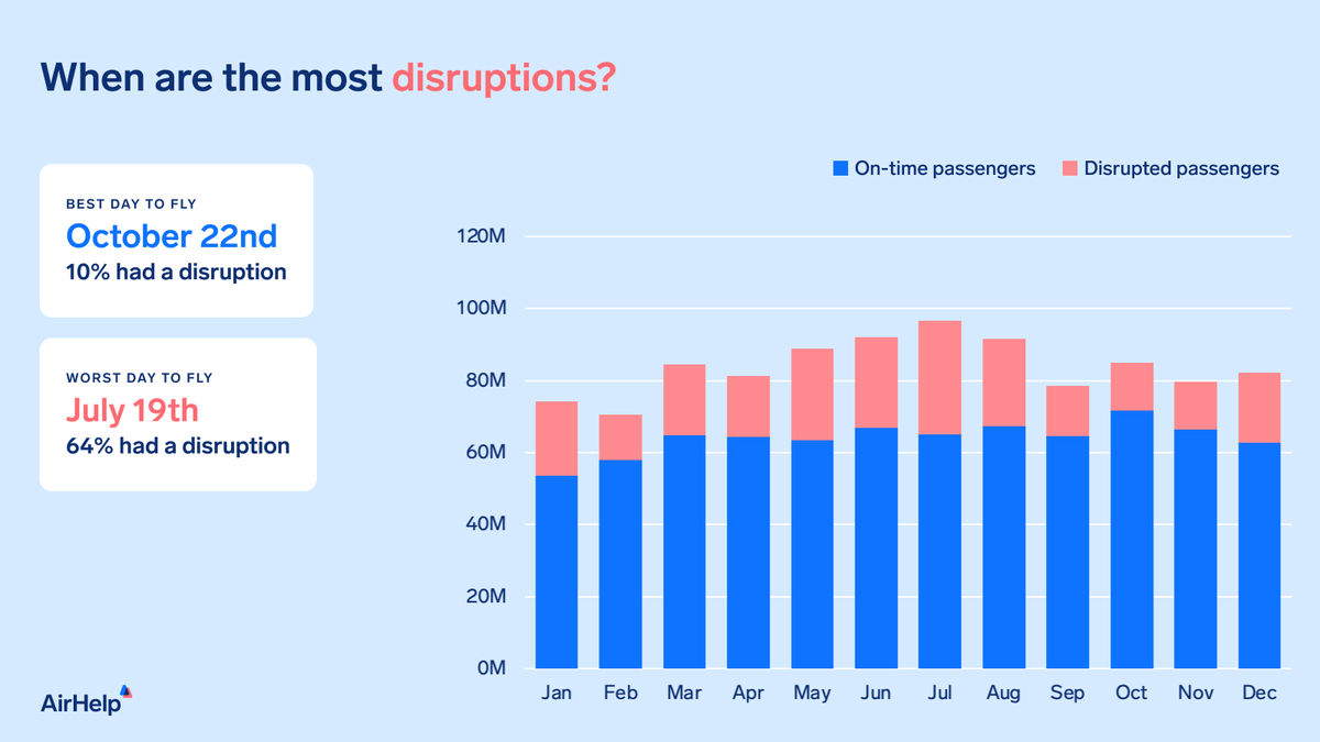 July was of course, when the Crowdstrike outage occurred. In fact, the day of the outage, July 19th, was the most disrupted day of the year. 64% of US passengers experienced a delay or cancellation that day, for a total of 2 million affected.