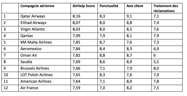 Pour établir le classement des compagnies aériennes, AirHelp prend en compte trois critères : le traitement des réclamations, la ponctualité des vols et la satisfaction des clients.