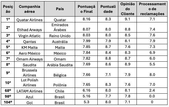 Entre as empresas aéreas nacionais, a Latam Airlines (68ª posição) obteve nota 6.16 no cômputo geral e recebeu nota 8 para pontualidade, 8.1 no quesito opinião dos passageiros e 2.4 para o processamento de reclamações. A Azul, a segunda colocada entre as brasileiras obteve nota 5.16 na avaliação geral, 7.7 em pontualidade, 7.8 na opinião dos consumidores e 0.0 para o processamento de reclamações. A Gol, por sua vez registrou 5.03 de nota geral com 8 para pontualidade, 7.1 para opinião do consumidor e 0.0 para processamento de reclamações.