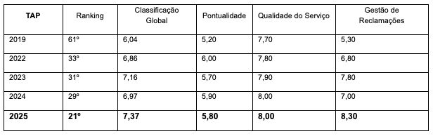 Na análise referente a Portugal, verifica-se que a TAP Air Portugal se encontra, este ano, na 21ª posição do ranking, com uma pontuação global de 7,37. Esta posição representa uma subida de oito lugares face a 2024, quando a TAP se posicionou no 29º lugar do ranking.