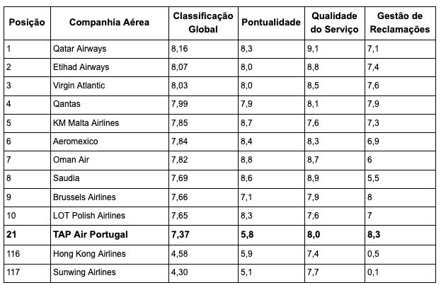 70 das 117 companhias aéreas presentes no ranking apresentam classificação negativa na gestão das reclamações; TAP Portugal é a melhor companhia aérea do mundo neste parâmetro.